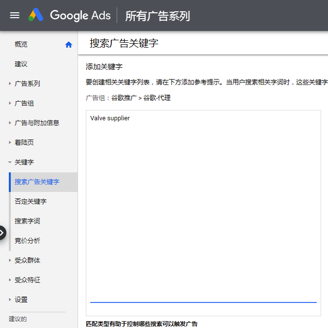 在設(shè)置匹配類(lèi)型之前,首先看看如何選擇我們要投放的關(guān)鍵字及關(guān)鍵字。天擎天拓優(yōu)化師在給客戶投放廣告時(shí),會(huì)使用Google關(guān)鍵字規(guī)劃工具查詢(xún)客戶要投放的關(guān)鍵字的搜索量,選擇有搜索量的關(guān)鍵字作為客戶要投放的詞,在確定好要投放的關(guān)鍵字之后,再設(shè)置匹配類(lèi)型。匹配類(lèi)型的使用非常重要,Google