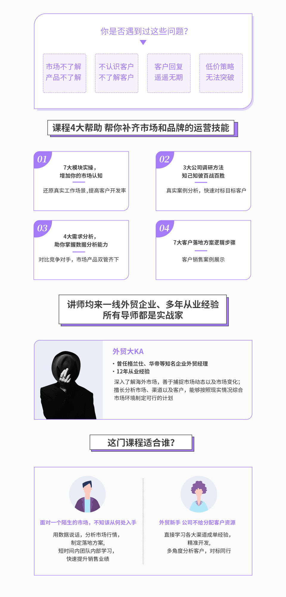 面對一個陌生的市場,我們應(yīng)該從何處入手呢?怎樣才能更有效的開發(fā)新市場? 本課程從分析市場開始,先了解市場特點(diǎn),然后找到有效拓展客戶的方式,包含客戶分析、趨勢分析等。最終制定出一套方案,助你高效的拓展新市場!